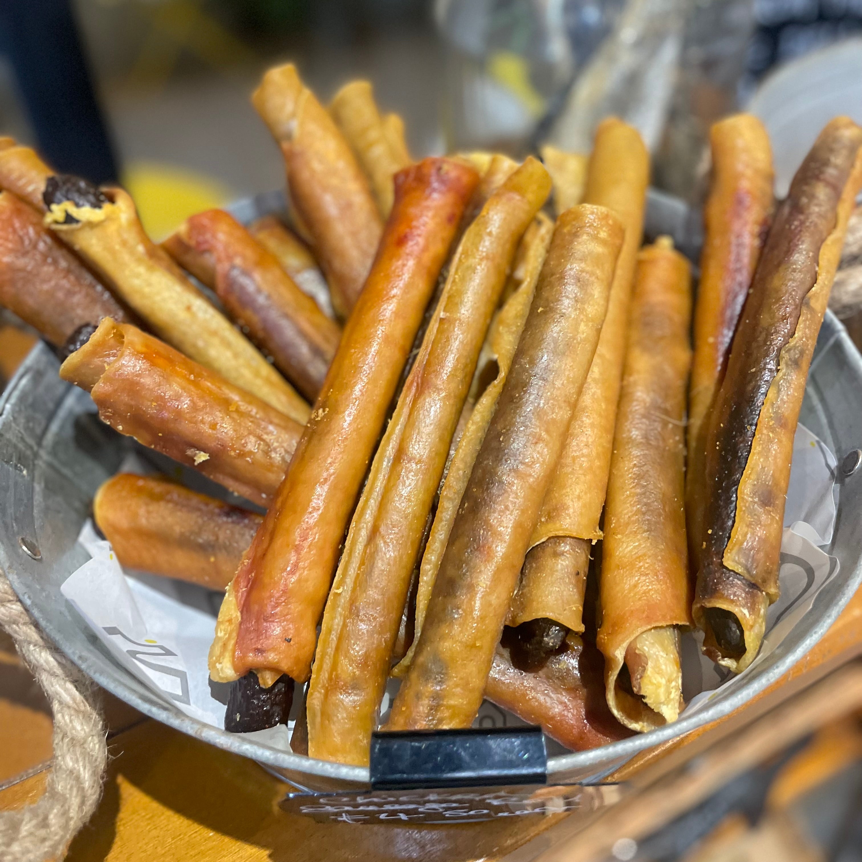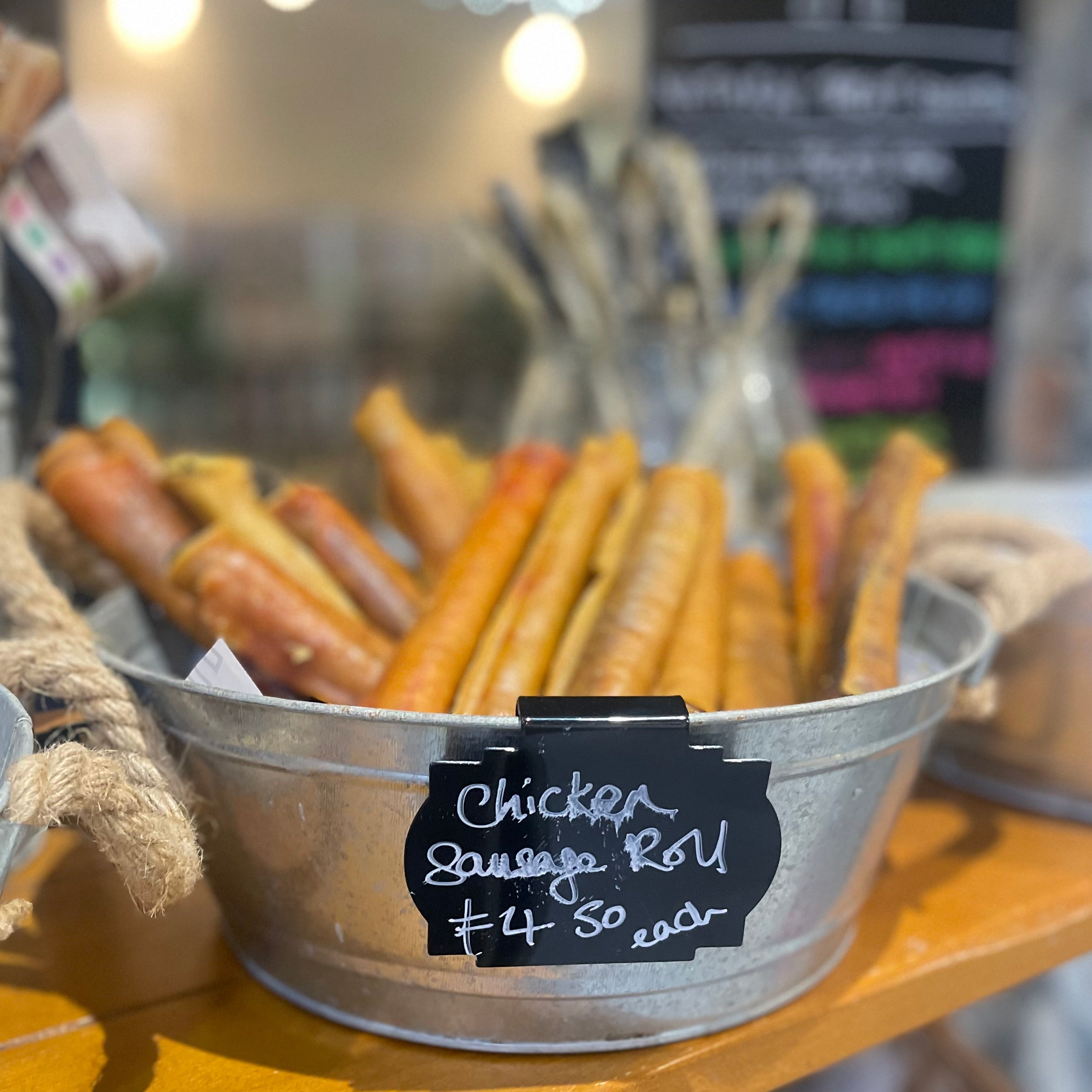 These gourmet chicken sticks, wrapped in pork rind, make a delicious Sausage Roll Treat that is loved by dogs of all shapes and sizes. They are slow roasted in their own juices to ensure a mouth watering taste in every bite!